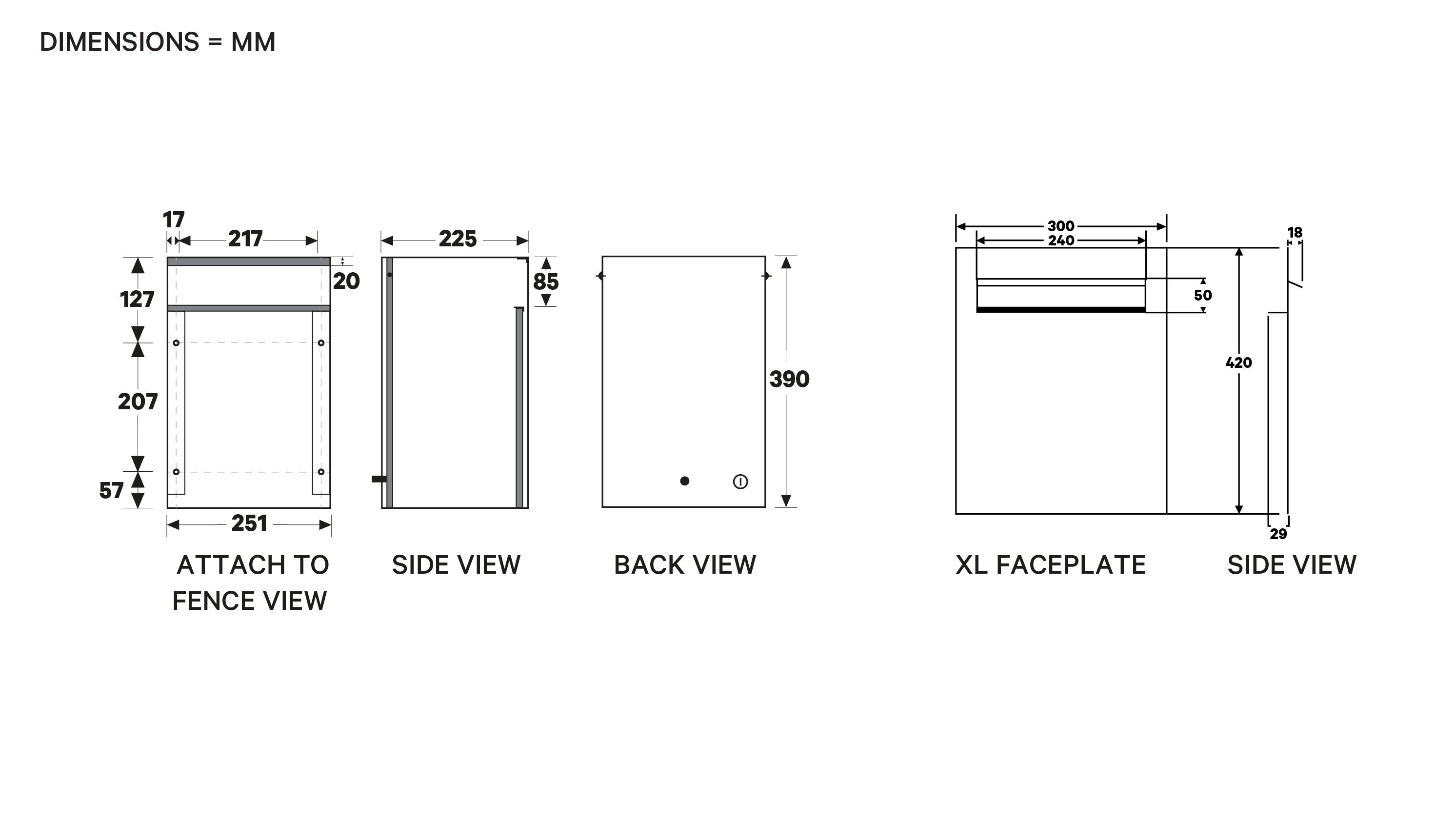 Designed to mount behind a fence, with an extra-large stylish faceplate facing the street to cover the whole front of the letterbox. Well suited for slatted or pool fencing to create a sleek finish.